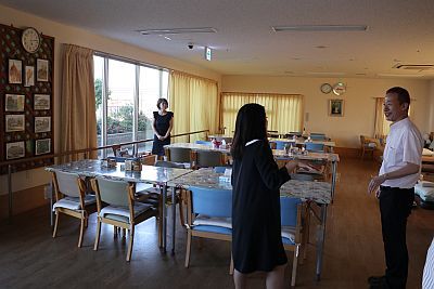 その後、徒歩で10分ほどの“らいおんハートリハビリ温泉ショートステイ”に移動し、施設館内の見学をさせていただきました。
