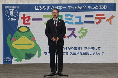 大久保勉 久留米市長の開会挨拶久留米市長の挨拶でスタートしたセーフコミュニティフェスタでは、市内の小中学生が作ったセーフコミュニティ標語の優秀作品表彰や、各対策委員会におけるパネル展示などが行われました。