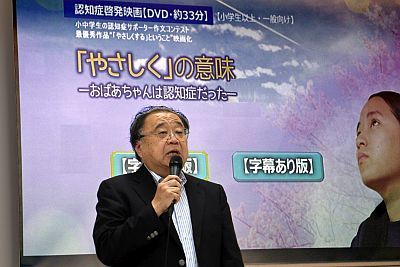 安全啓発映画祭では、(株)映学社制作の認知症理解のための『「やさしく」の意味~おばあちゃんは認知症だった~』が上映されましたが、それに先立ち、映画監督を務められた映学社代表取締役の高木裕己氏による特別講演「認知症サポートの秘訣」が行われました。