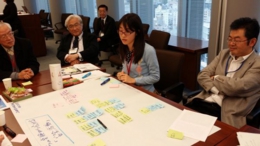 ワールドカフェとは、カフェで雑談するような自由な雰囲気の会議方法のことで、参加者から多くの質問や意見が集まりました。